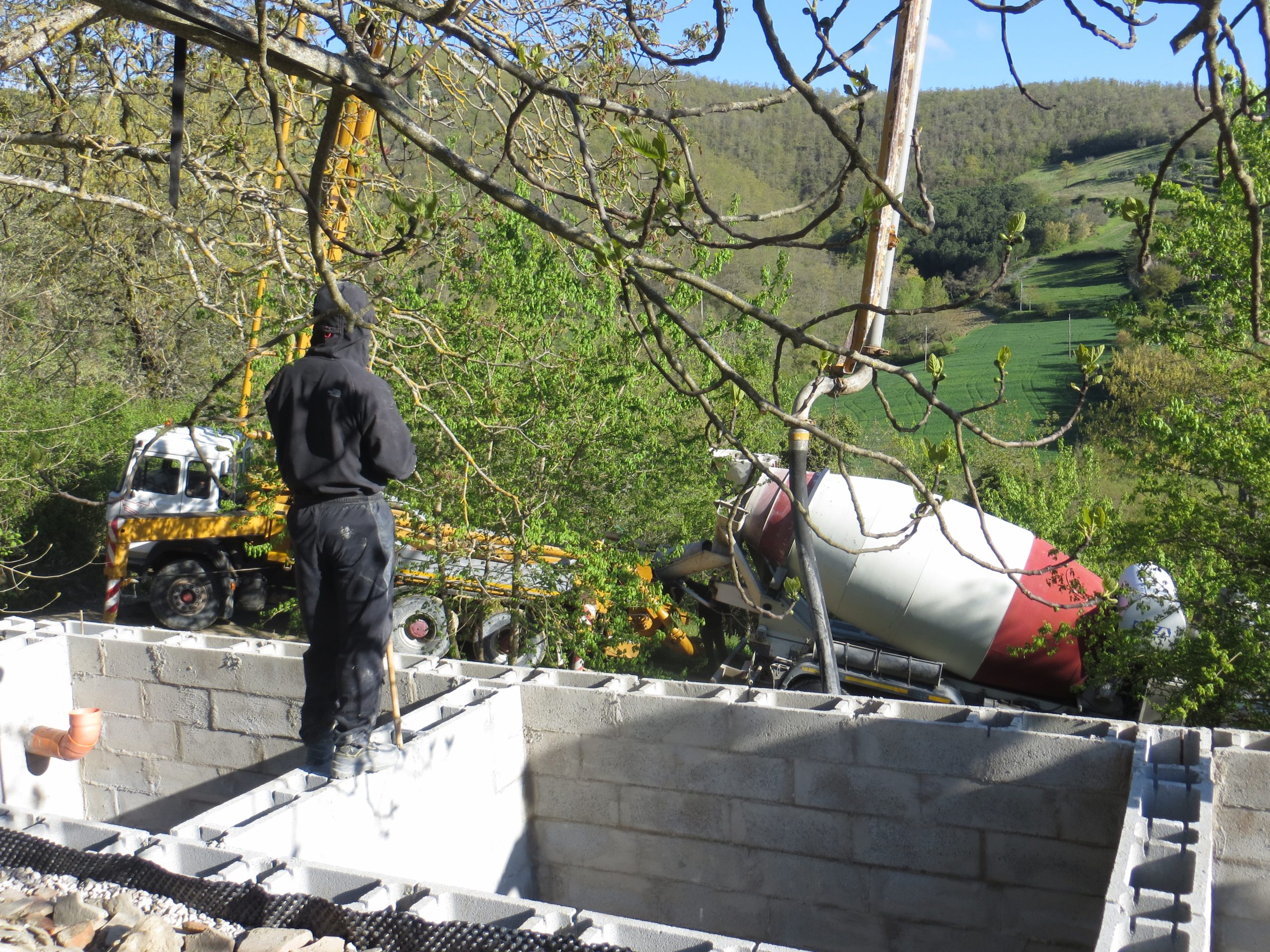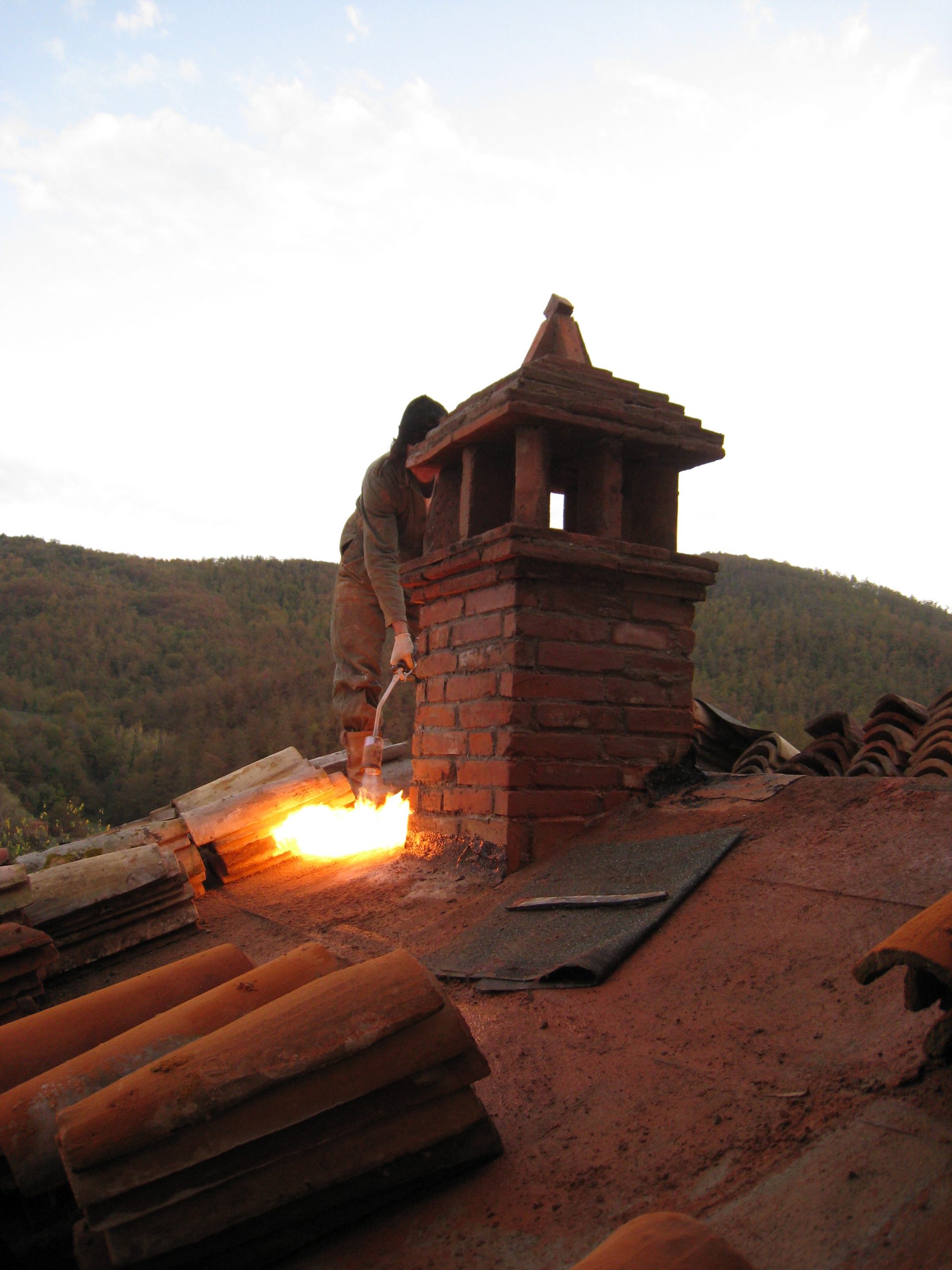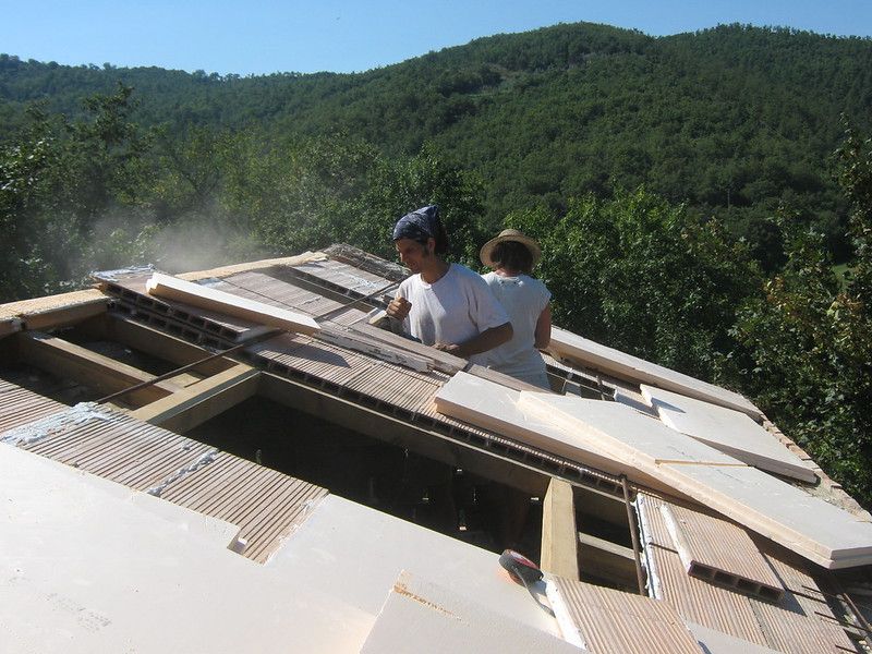 With the roof slab on, the insulation down, the chimney built, it is time for felt and ‘coppi’.